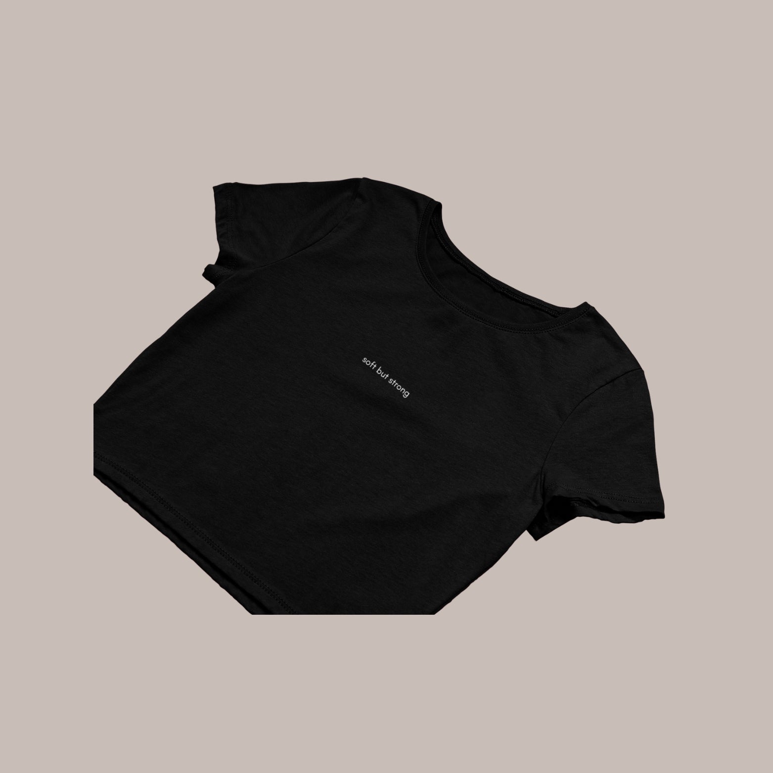 Minimal embroidery with “Soft but Strong” typography – understated but powerful