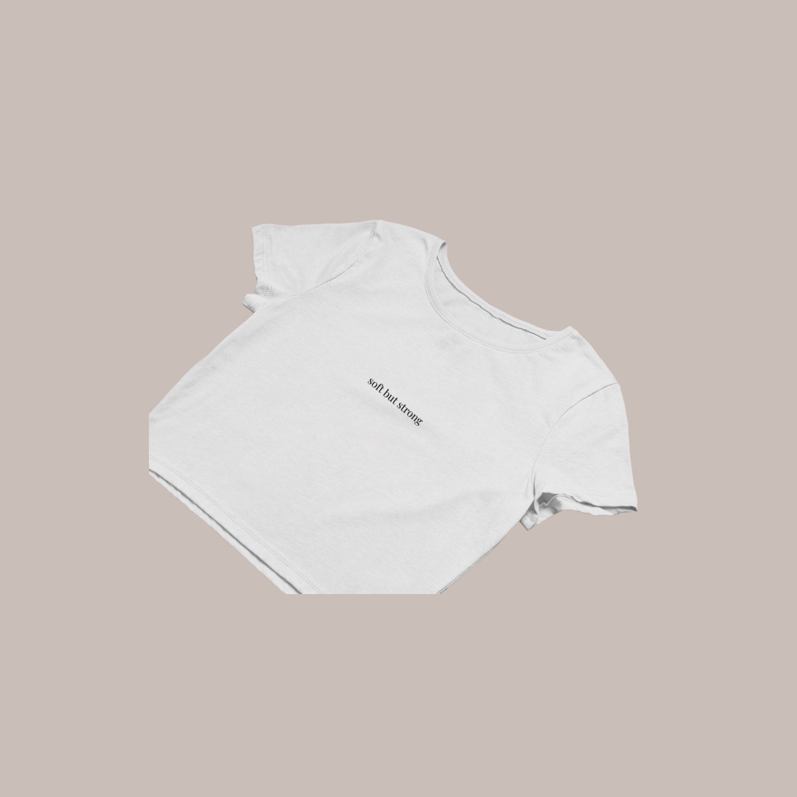 Minimal embroidery with “Soft but Strong” typography – understated but powerful